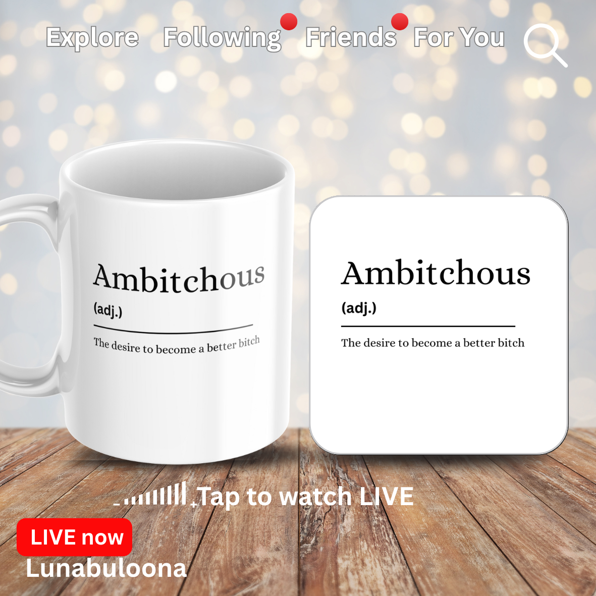“Ambitchious” Funny Typography Coaster – 9x9cm Cork Backed