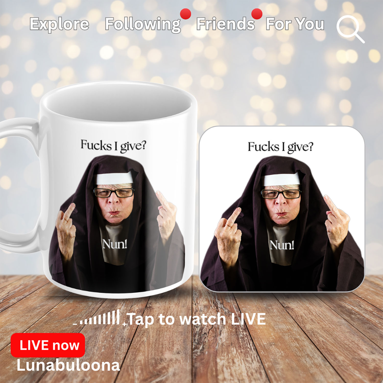This gloriously rude design features a savage nun throwing up double middle fingers, surrounded by the words Fucks I Give: Nun — because sometimes religion and holiness = honesty.